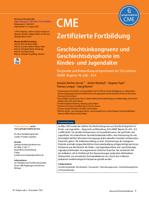 Neue CME-Fortbildung von Prof. Dr. Richter-Unruh et al. zur AWMF-Leitlinie Geschlechtsinkongruenz und Geschlechtsdysphorie im Kindes-und Jugendalter. Informationen zur Diagnostik und Behandlung entsprechend S2k-Leitlinie, AWMF-Register-Nr.028–014 (Monatsschr. Kinderheilkd.2025) siehe beiliegenden PDF.